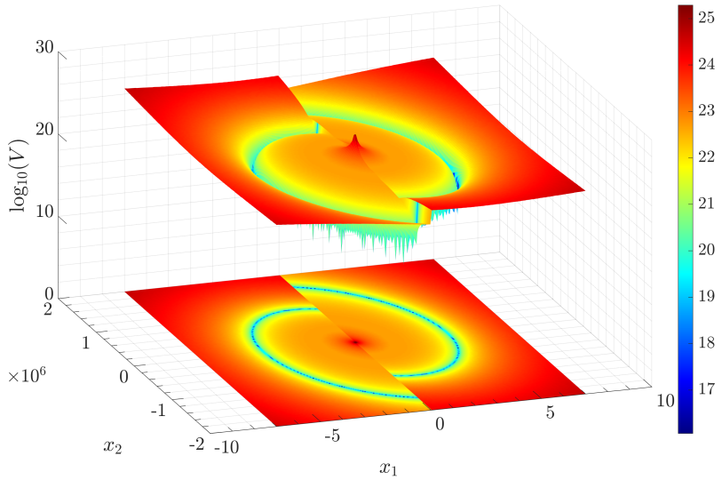 Fig. 3 Logarithmic representation of the Lyapunov function \(V\) in (19), for the value \(\theta = 3\pi/4\).#