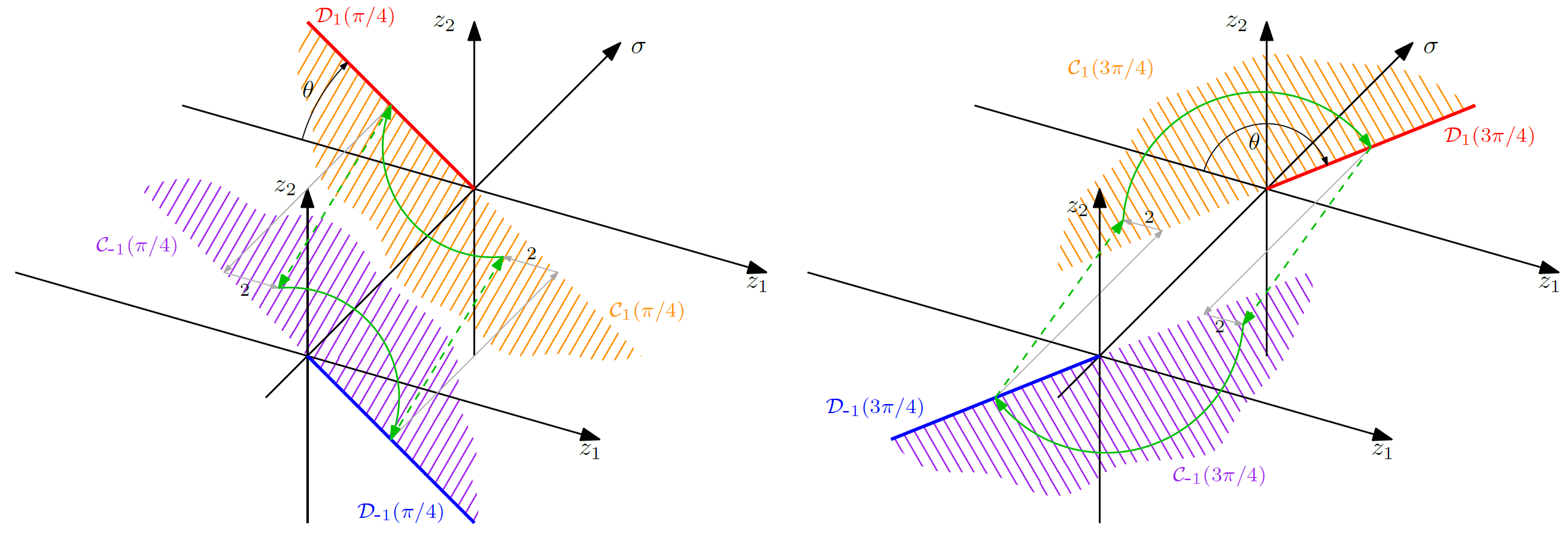 which corresponds to the green-colored half line parallel to \(\mathcal{D}_{\mathrm{-}1}\) in Fig. 2. Then, for each point \(z \in\mathcal{C}_1\setminus\{0\}\), denote the compact time interval associated with the unique backward and forward flowing solutions of (7), flowing in \(\mathcal{C}_1\), as