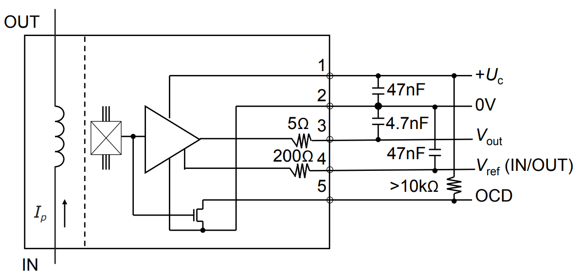 The final choice is for a Hall effect sensor. One common possibility comes from the LEM family, in particular the HO series. They are distinguished by the current range (6/10/25) and the supply voltage in the output side (3.3/5 V).