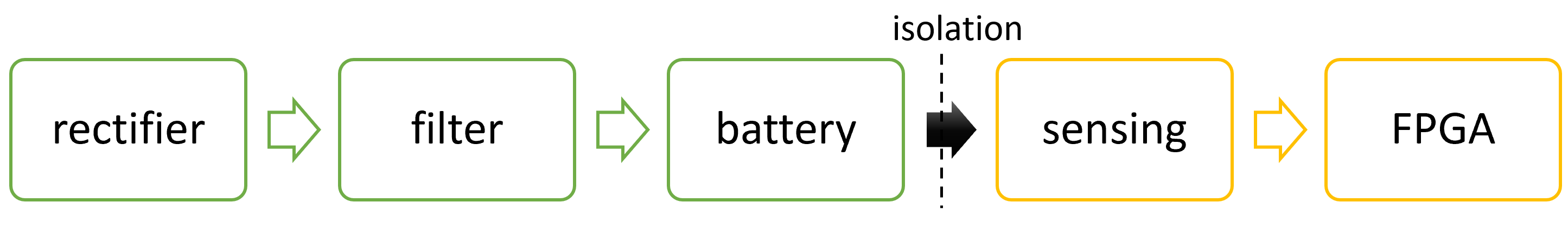 The requirement behind this sensing stage is to keep the ground of the battery separated from the one of the FPGA. To this end, we aim at using isolated sensors. Therefore, for the current a Hall effect sensor is used; while, for the voltage an isolated operational amplifier is used. Outputs of the sensors are actively filter with operational amplifiers (LPF) to reduce the noise. Finally, ADCs are used to transform the signals in digital ones, directly connected to the FPGA with a parallel interface.