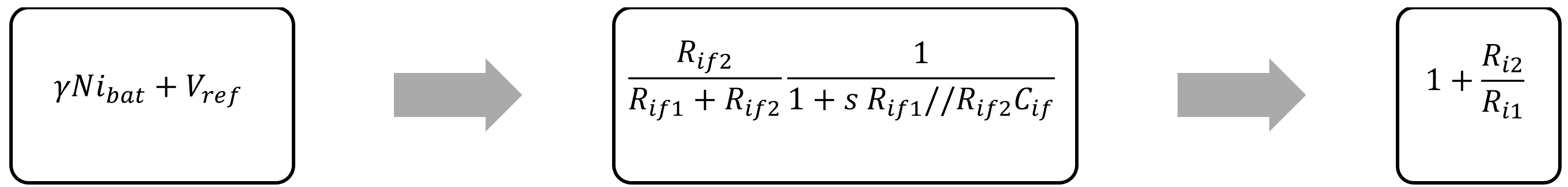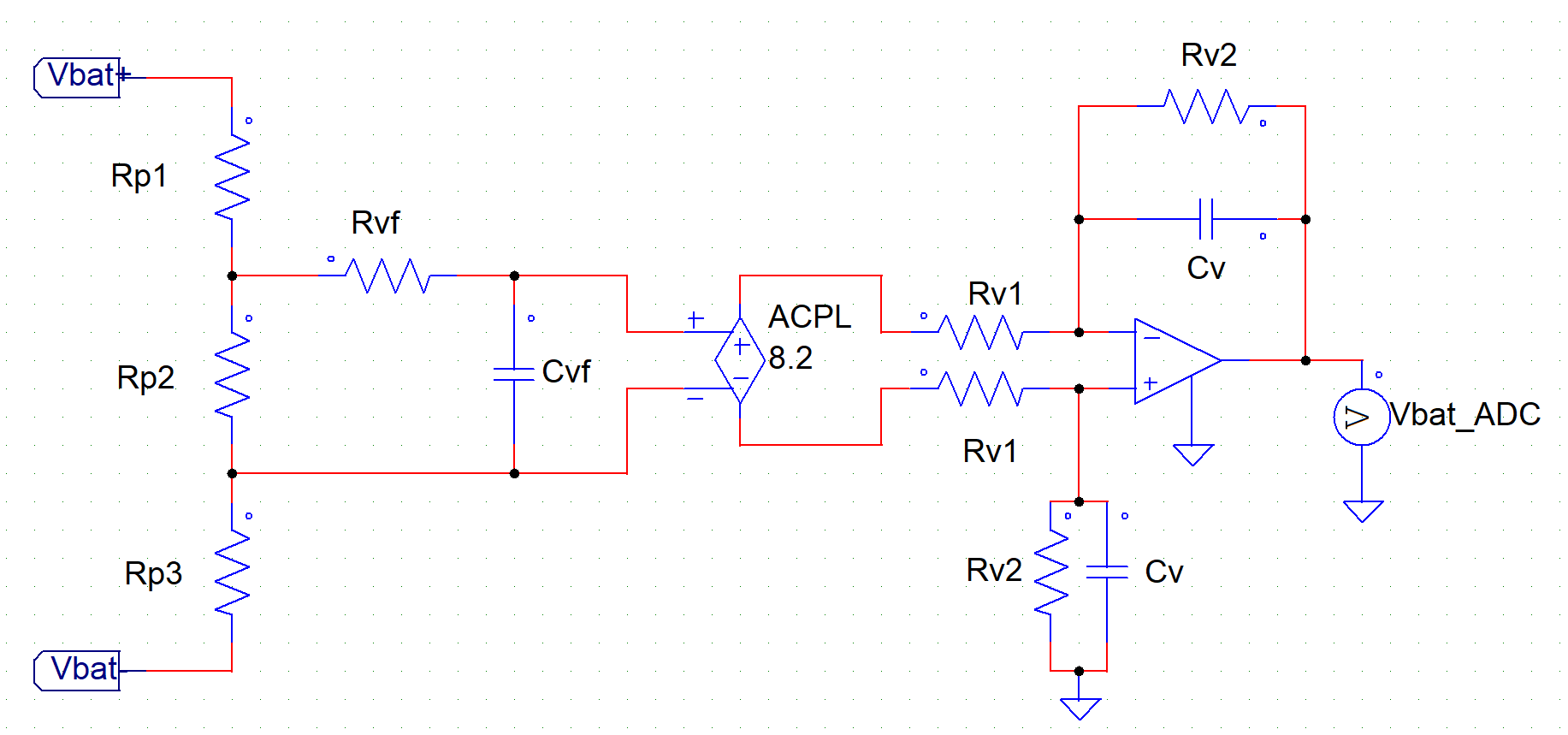 In ideal condition (almost constant voltage on \(R_{p2}\)), the input differential voltage corresponds to \(v_{\text{in}} = \frac{R_{p2}}{R_{p1} + R_{p2}}v_{\text{bat}}\) and the cut-off frequency of the input filter is \(f_{\text{vi}} = \frac{1}{2\pi R_{\text{vf}}C_{\text{vf}}}\). We also need \(R_{\text{vf}} \gg R_{p2}\) to have a “simplified” version of the cut-off frequency