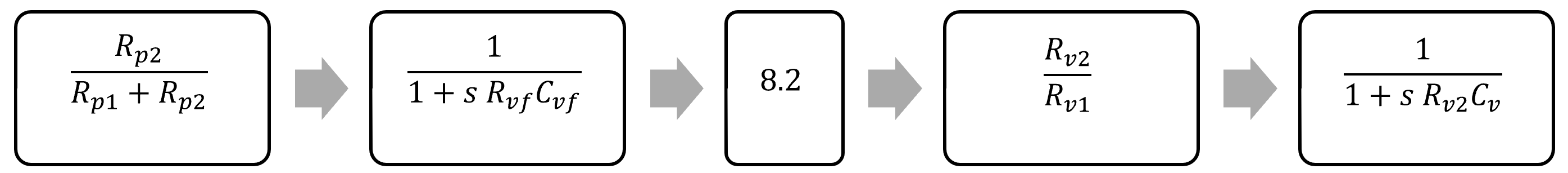 Full transfer function \(V_{\text{bat}} \rightarrow V_{\text{in}}\) is \(H(s) = \frac{R_{p2}}{R_{p1} + R_{p2}}\frac{1}{1 + s\left( R_{\text{vf}} + \frac{R_{p2}R_{p1}}{R_{p1} + R_{p2}} \right)C_{\text{vf}}}\)