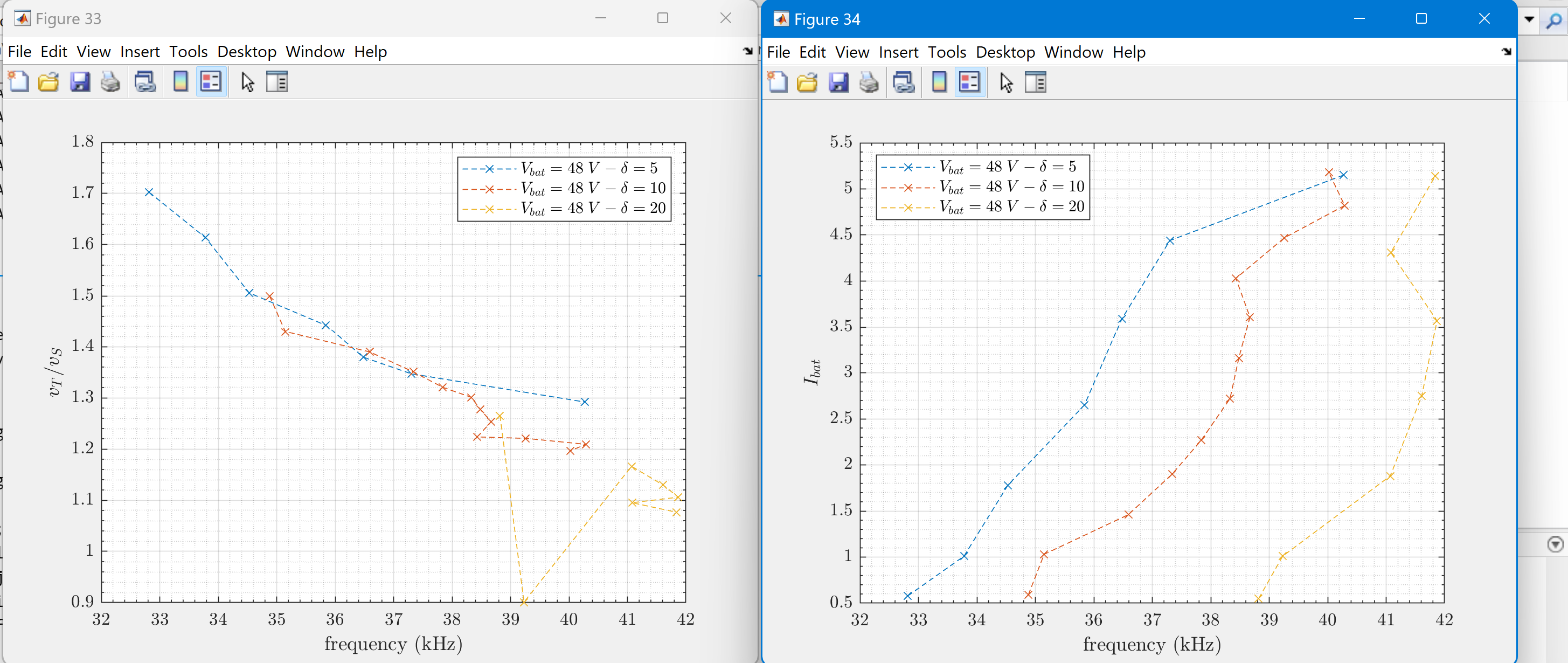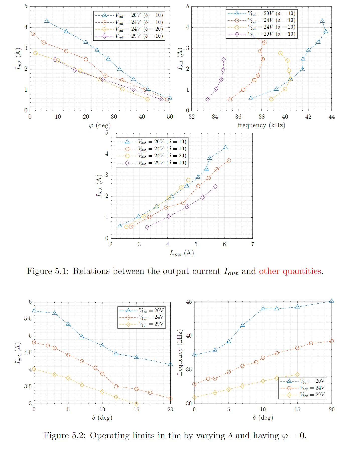 17 May - Clean the chapter of the thesis on the design i he descansat. In the afternoon I’ve done some measurements for different value of the output voltage, so far they seem to track what expected. Anyway, the converter is working with 24V and not with the 48V for which it was designed. I need to check the proper definition for ZVS and ZCS, mostly ZCS to check if it is happening. Below, the curves obtained from the measurements. They match the one that Carlos has in the presentation.