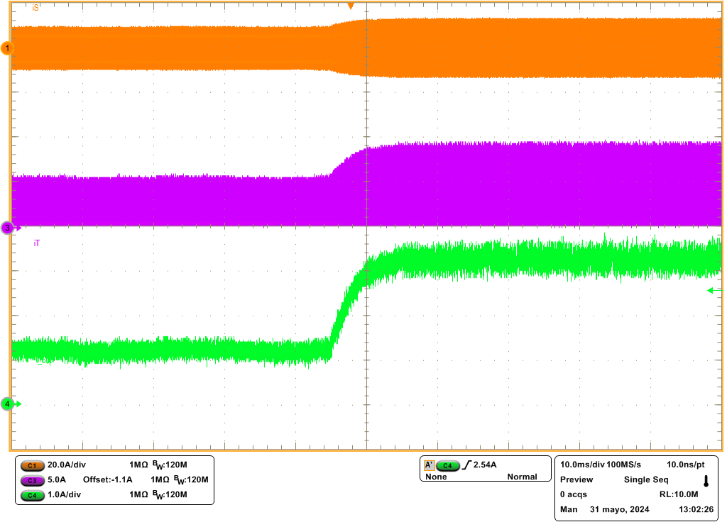 Fig. 20 Current (purple) and voltage (green) at the electronic load during the startup phase.#
