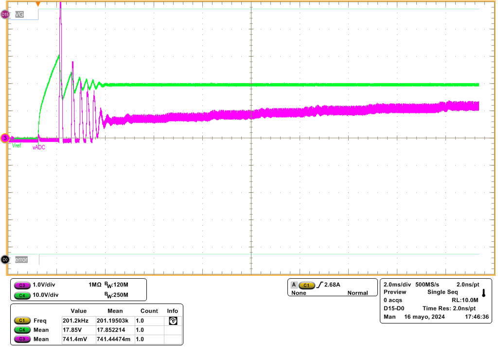 Then, why is the converter turning OFF when I use the CL but not when it is in open loop? I’m testing at 24V. For some reasons, in OL the voltage \(v_C\) is within the forecast bound. In CL, it is overflowing it, causing the ADC to go in overflow. One way it to clip the value in the FPGA by managing the overflow bits, another way is to change the sensing circuit. In the end I change the resistor Rpv1, the one that steps-down the voltage on the tank side, from 4.8kOhm to 8.2kOhm. I’ve also added a piece of code that should manage values out of the range, I think the problem was meanly related to the fact that we are inverting the number, and the negative overflow 100000 corresponds to the same, which then was read as a number with inverse polarity.