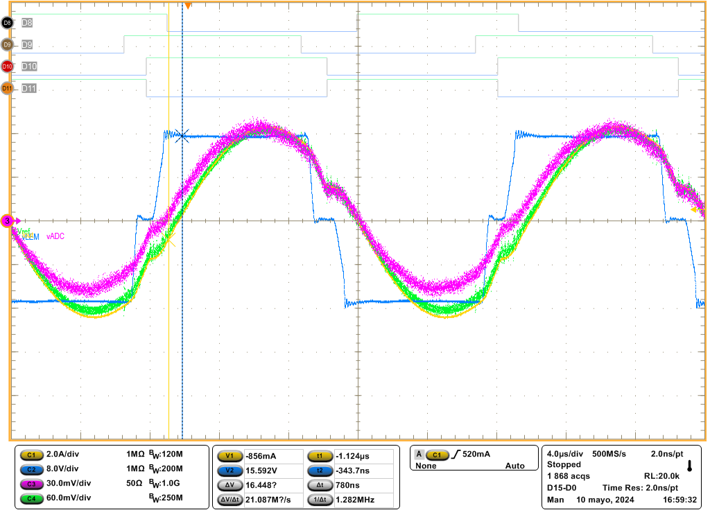 Fig. 17 Distortion in the tank current sensing. Current (yellow), voltage after the transformer (green), voltage after the 49.9Ohm or at the input of the ADC card (purple).#
